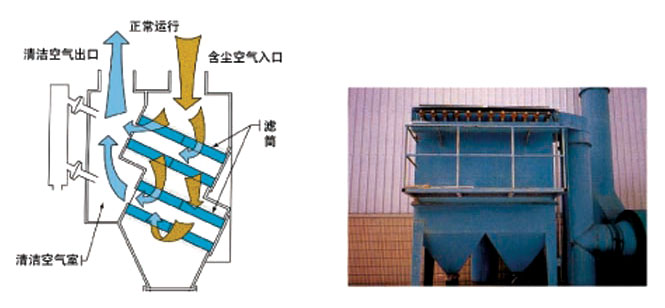 當(dāng)濾筒表明捕集的粉塵達(dá)到一定數(shù)量時(shí),濾筒的過濾阻力也隨之達(dá)到某一定值時(shí),控制閥將自動(dòng)打開,壓力空氣直接沖入濾筒中心,把捕集在濾筒表面的粉塵吹凈,粉塵在重力的作用下,隨著氣流下沉集塵斗中。。